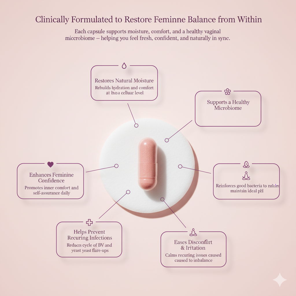 Each capsule supports an ideal pH, strengthens your natural defenses, and helps prevent recurring BV or yeast infections—without hormones or harsh treatments.